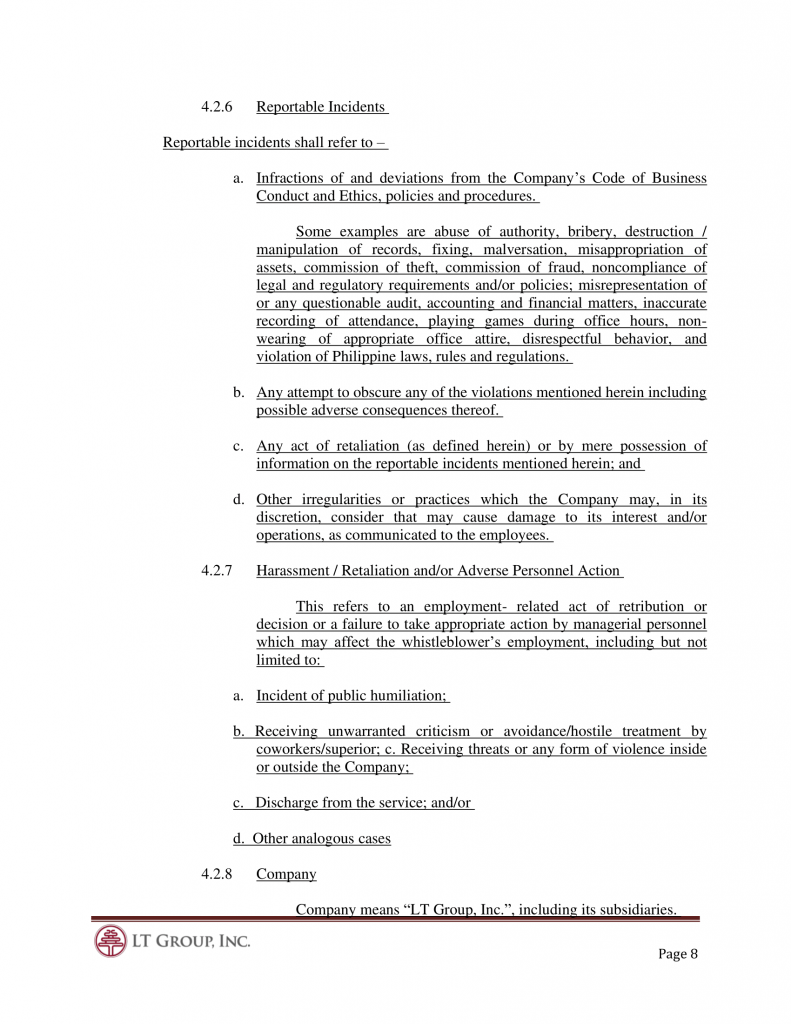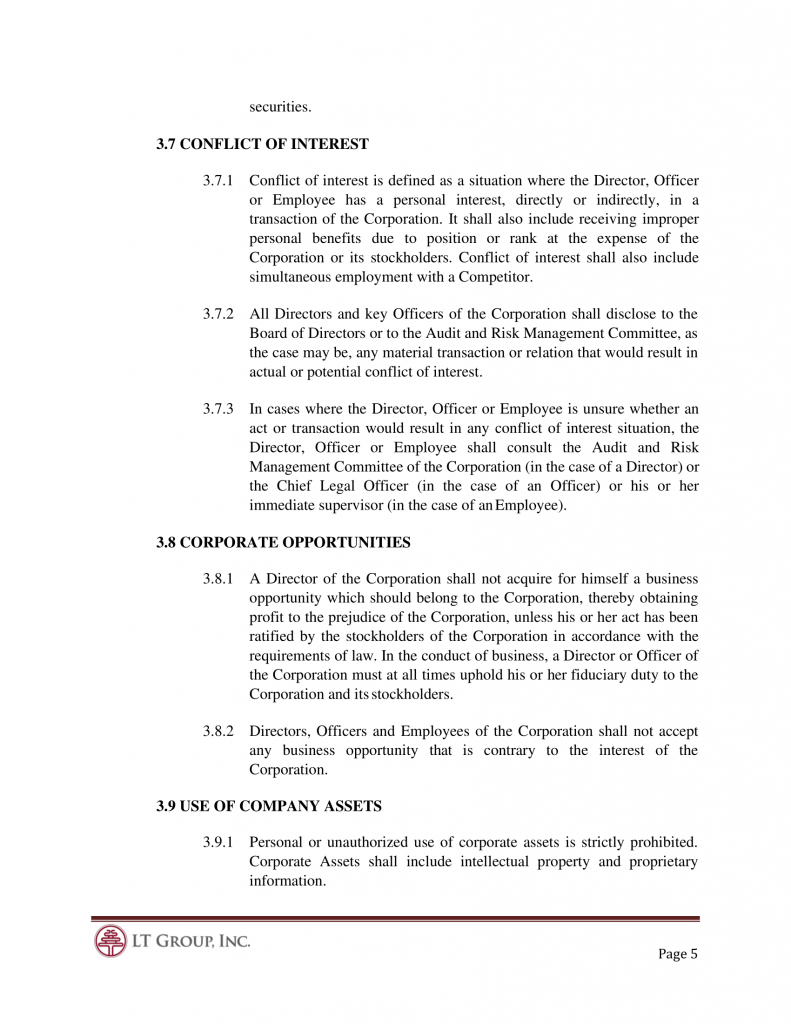 This Code of Business Conduct and Ethics (“Code”) of LT Group, Inc. (“Corporation”) has been established to serve as a guide for professional and ethical conduct. It shall apply to all Directors, Officers and Employees of the Corporation