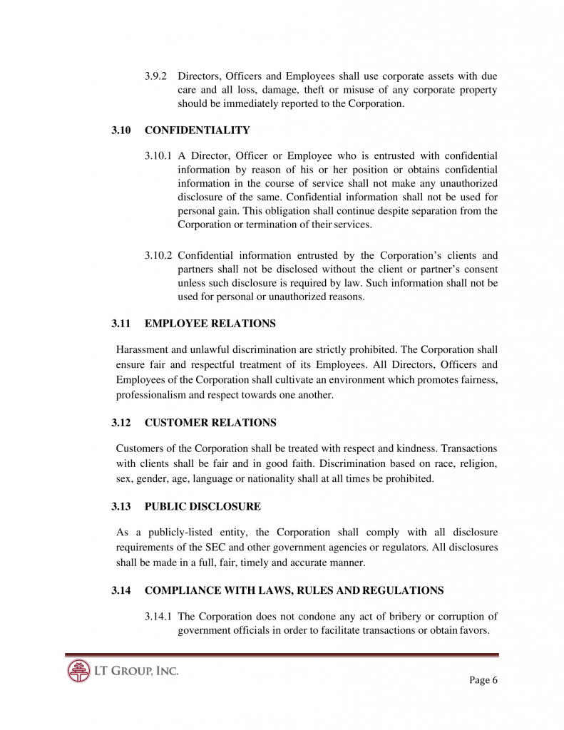 3.13.1 The Corporation does not condone any act of bribery or corruption of government officials in order to facilitate transactions or obtain favors.