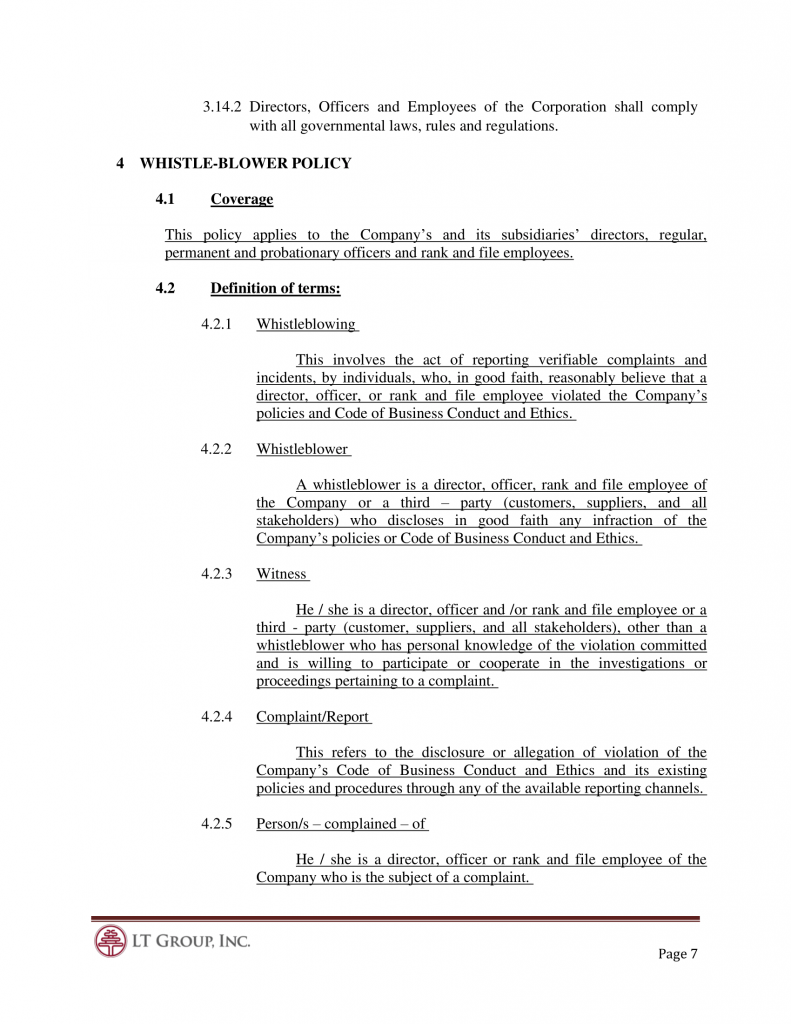 4.3.1 In order to encourage Director, Officers and Employees to report any known or suspected violation of the Code or any act of misconduct, any report made under this Whistle-Blower Policy of the Corporation shall be considered confidential and the Corporate Governance Committee shall oversee that measures are taken to protect the complainant from any form of retaliation.