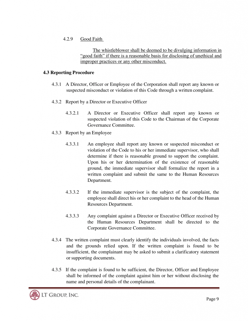 4.1.1 A Director, Officer or Employee of the Corporation shall report any known or suspected misconduct or violation of this Code through a written complaint.