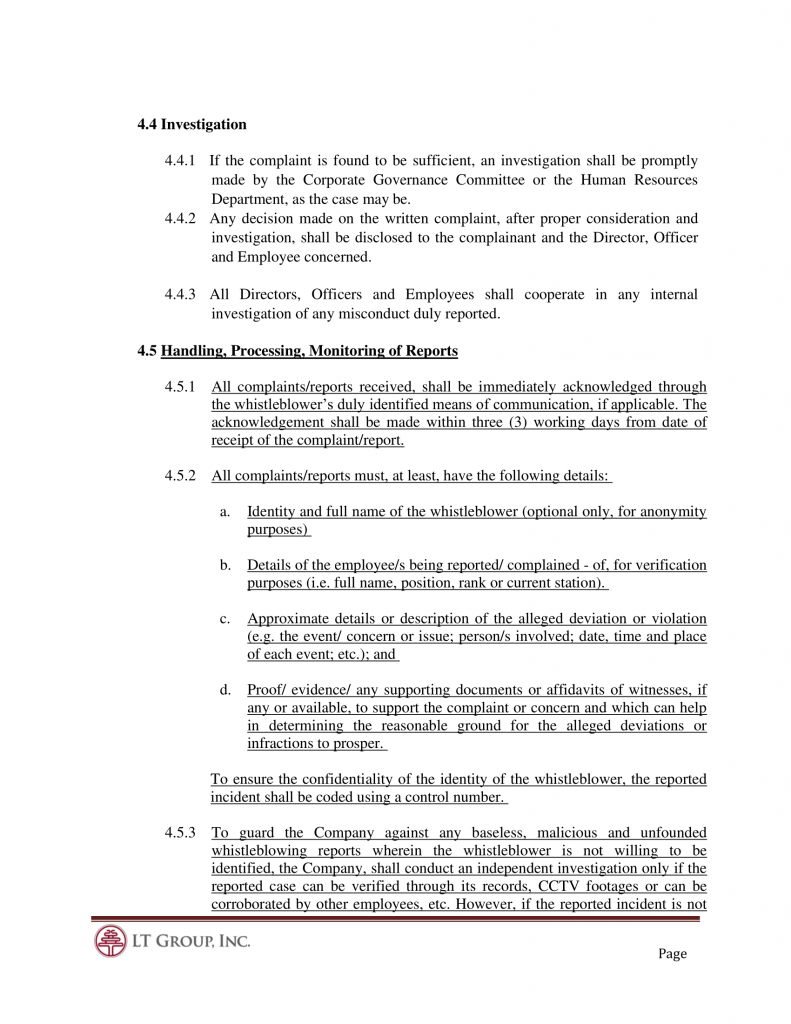 4.2.2 Any decision made on the written complaint, after proper consideration and investigation, shall be disclosed to the complainant and the Director, Officer and Employee concerned.